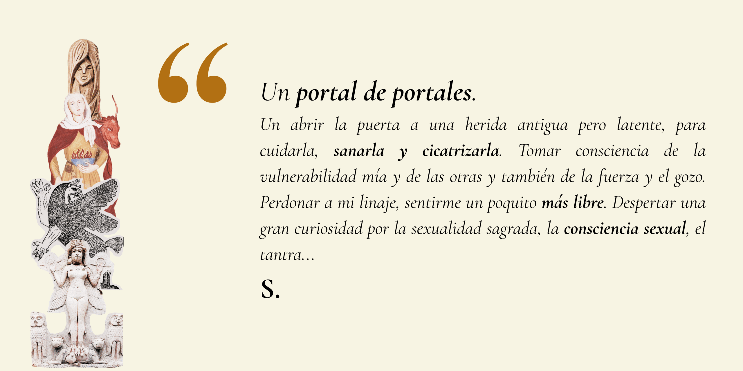 A través de un Viaje Integral Grupal semionline de 8 meses traerÔs presencia a tu cuerpo, desharÔs las corazas que te bloquean, rehabitarÔs tu sexualidad y ciclicidad femenina, darÔs voz a tu naturaleza interna y reunificarÔs el canal útero-corazón, con el objetivo de vivirte desde el placer, la autenticidad y el bienestar.